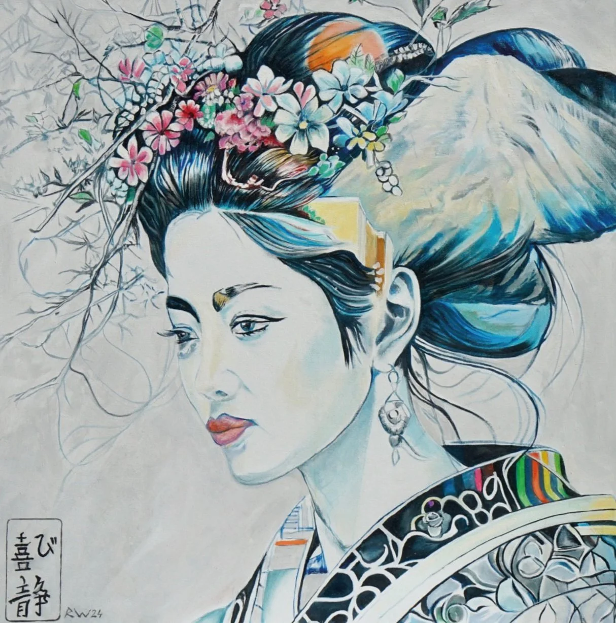 Freude und Ruhe - In diesem Gemälde wird die Essenz altehrwürdiger Schönheit und Tradition Japans durch durch den Filter einer modernen Ästhetik eingefangen. Das Motiv, eine Frau mit einer traditionellen Frisur und einem floralem Kanzashi, verkörpert die Anmut und Eleganz, die über alle Epochen hinausreicht. Sie steht für Demut und Natürlichkeit.